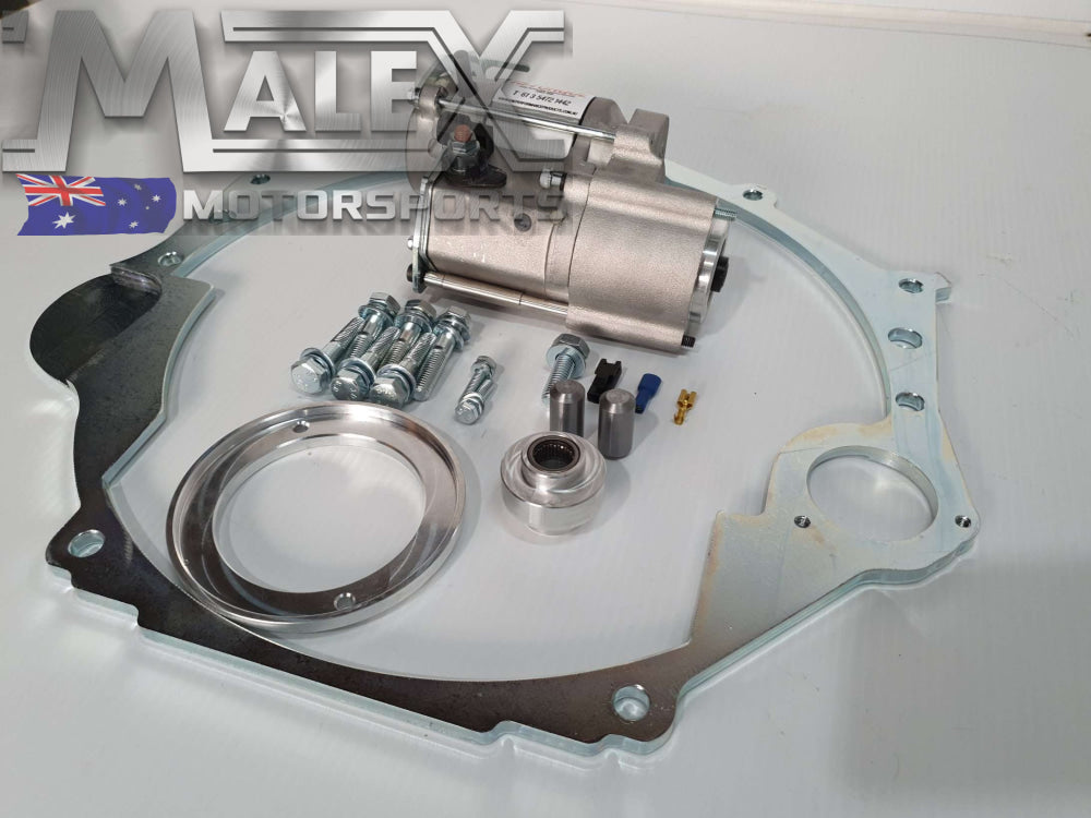 Step 7. Before re-fitting the transmission, you will need to relieve out the area on the bell housing where the starter pinion will sit and throw out. Re-fit the transmission to the engine using the supplied M10 x 50 bolts with washers and spring washers. Ensure that none of these bolts bottom out on the threads in the engine block.