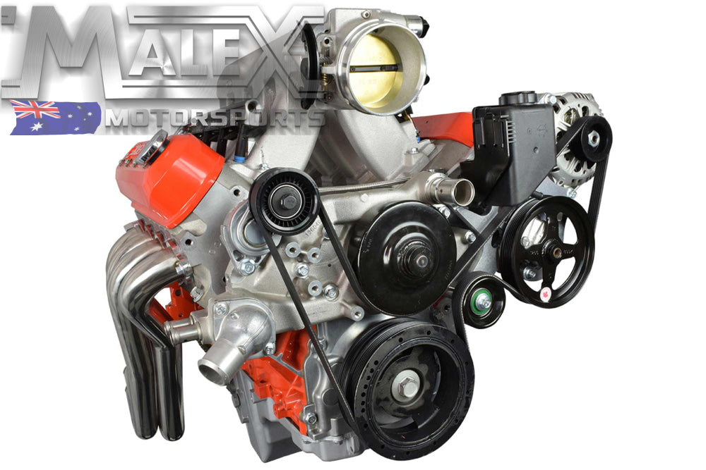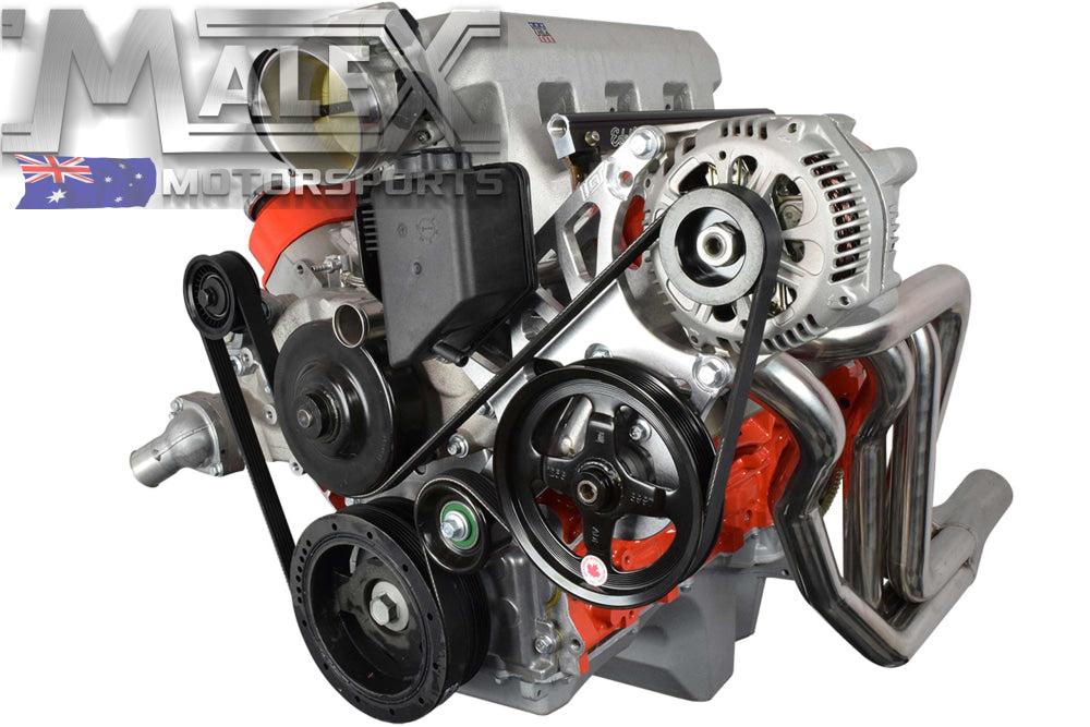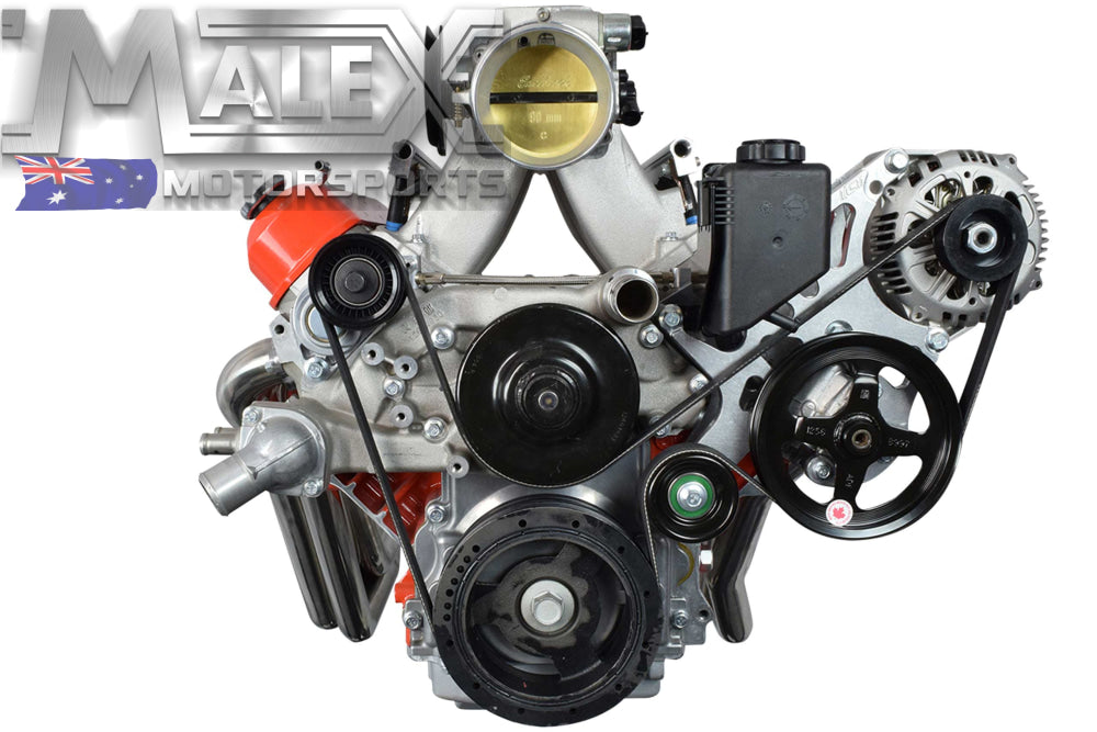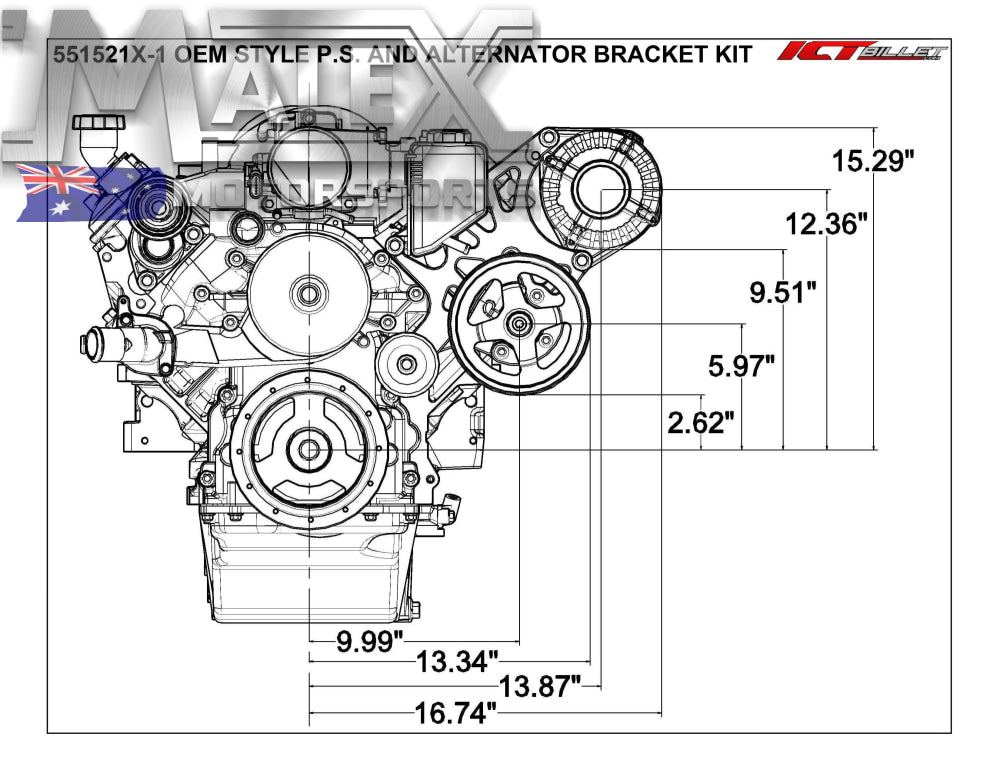 Uses OEM 1998 Corvette power steering reservoir (BKT103), bracket (BKT104), Fill Cap (551389), and 5/8" inlet rubber hose(BKT105)Power steering pump (551390). Power steering pump pulley (551391)