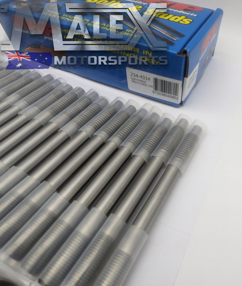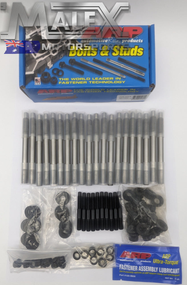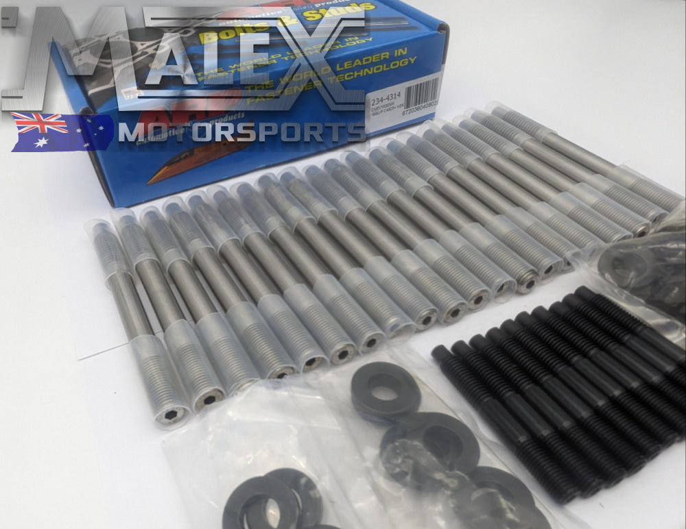 Part No 234-4314- includes a set of twenty Custom Age 625+ head stud, twenty parallel ground washers, twenty 8740 chrome moly steel 12 pt nuts, ten 8740 8mm studs and the appropriate nuts and washers which secure the intake side of the cylinder head to the engine block. 234-4314 includes a 1/2 oz. pack of ARP Ultra-Torque fastener assembly lubricant.