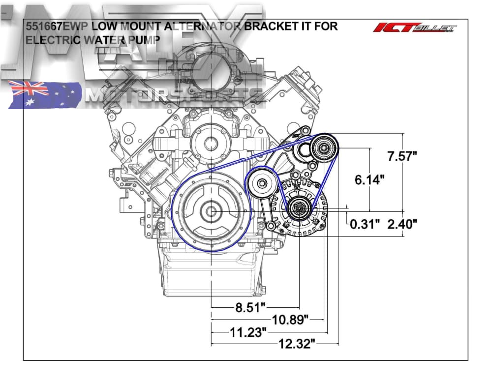 Mounts the alternator low on the driver side when using electric or remote water pump
