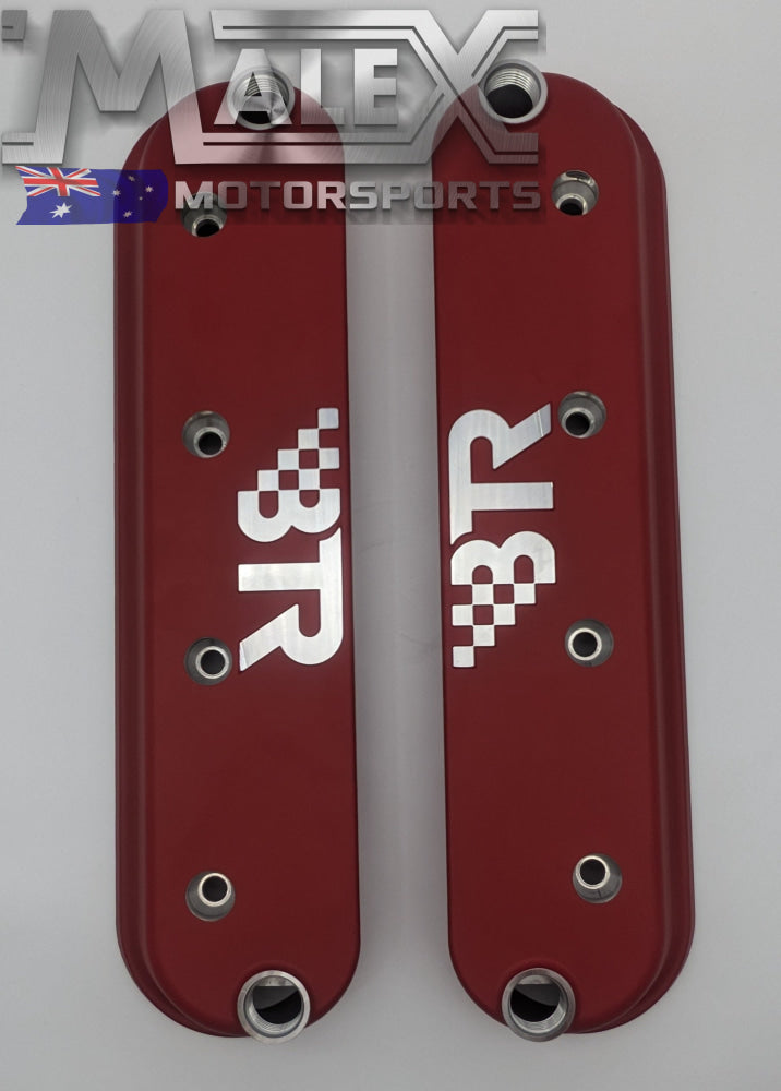 BTR valve covers are designed to fit and retain stock heights for OE GM Gaskets and bolts, but still give a unique plane to allow nose clearance for shaft rockers. The BTR valve covers come with -12AN ORB vents on both ends, this gives you a wide variety of options for vacuum pump plumbing or catch can. A special unique baffle/splash guard design so it will protrude below the valve cover surface. Made of Die cast aluminum available in 3 colours- silver, black, red. Call if you wish to order with coil mounts.