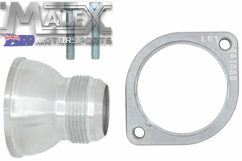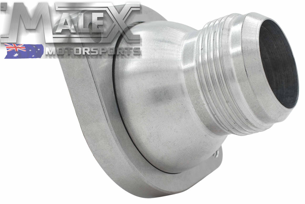 This thermostat housing converts water pump inlet to a -20AN male fitting for more durable, high pressure hoses