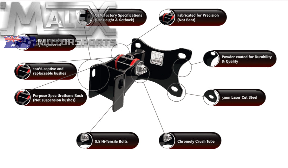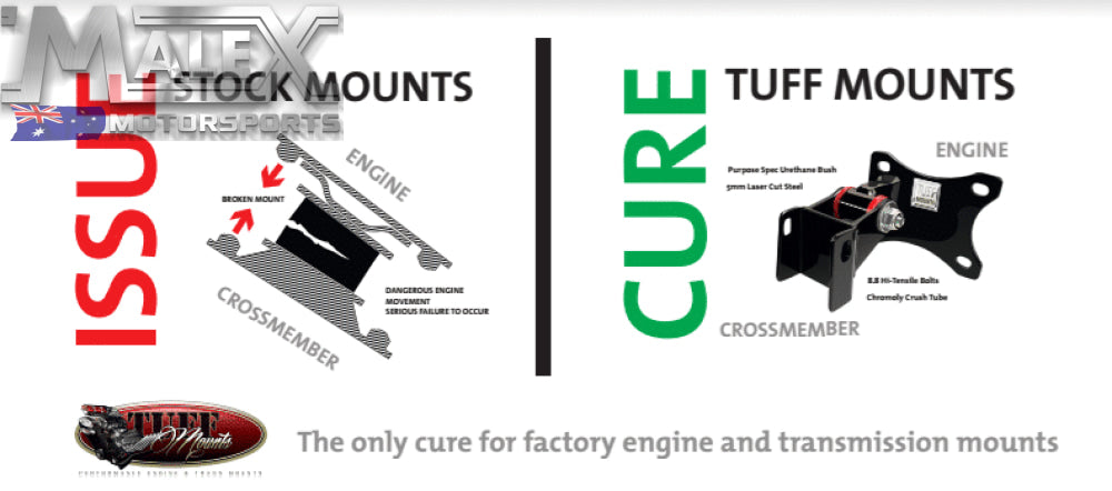 Tuff Mounts ensure the Engine sits in the Factory OEM Location, so all accessories still fit as per Original.